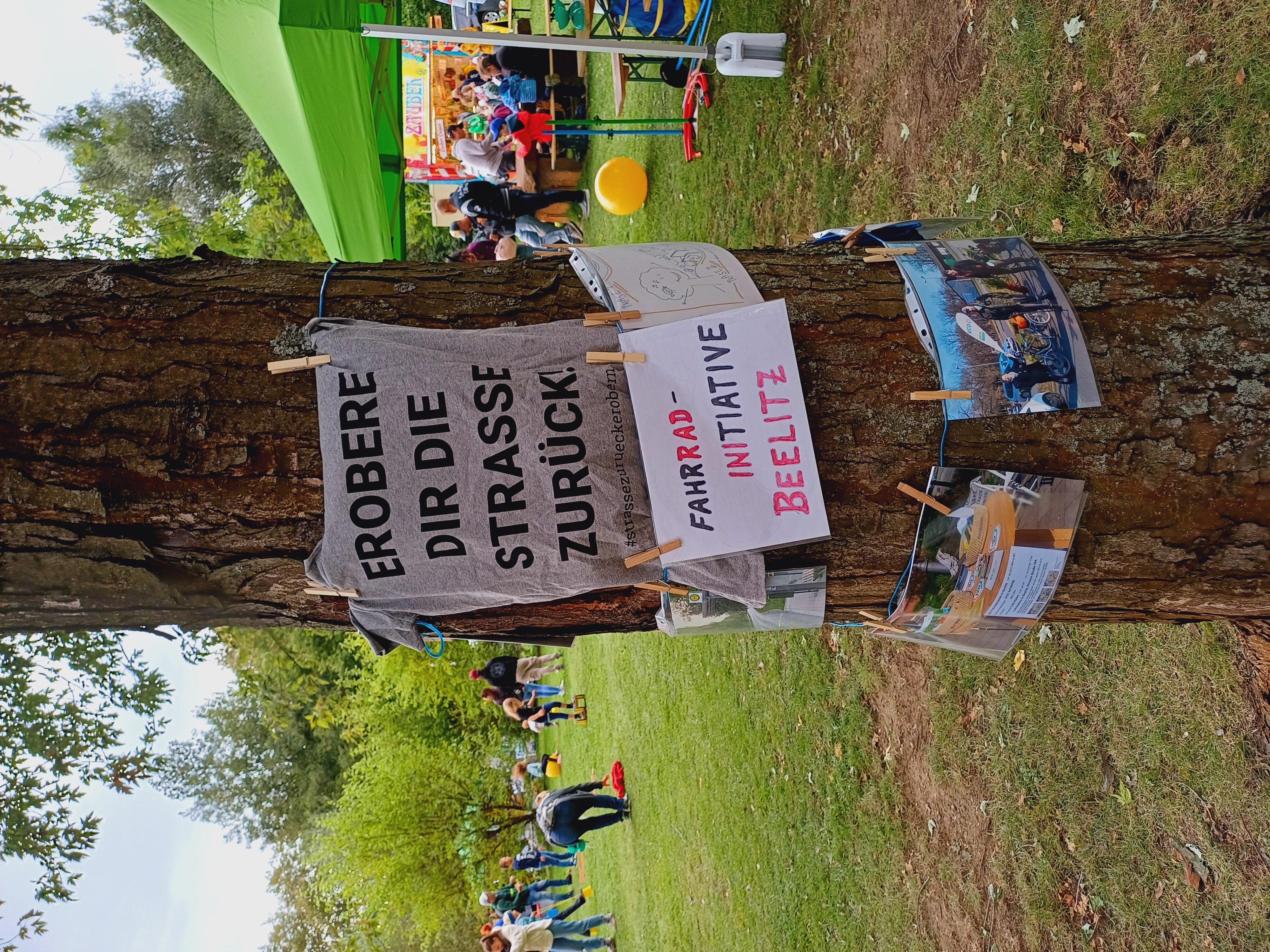 Die VCD Ortsgruppe Beelitz / Rad-Ini Beelitz war am 15.09.2024 auf dem Familienfest der Stadt präsent. Der Infostand war schnell gemacht: Fotos „20x30 cm“ in Klarsichthüllen DIN A4 an einer Wäscheleine, diese zwischen Pfahl und Fahrrad gespannt, und bei sehr starkem Wind eben um einen Baum gewickelt. Dazu kam die VCD BeachFlag und ein Blumenstrauß am Fahrradlenker, fertig. Besonderer Hingucker bei uns sind noch der Fahrradverleih und Umbau-Service von „Rec-Bikes by MG“, Tel. 0151 5774 9779. Die Kinder konnten an einer Bierzelt-Garnitur der Stadt ihren Schulweg zeichnen und erklären: „Das ist mein Haus, da geht es durch die Altstadt und über den Affenberg zur roten Schule“, in der Zeichnung seht ihr „Berg mit Affe“ von Luca. Die Postkarten zur VCD-Einsteiger-Mitgliedschaft und den ÖPNV-Check haben wir persönlich unter die Leute gebracht. Naja, die Gespräche dazu kennt man ja: Wir, also der Verkehrsclub Deutschland und rund zwanzig befreundete Verbände, haben jahrelang für Rahmenbedingungen gekämpft, die eine Bahnverbindung 2x pro Stunde auf den Hauptrouten ermöglichen, und dann kommen die frisch zugezogenen Speckgürtel-Städter und jammern, dass nicht dreimal pro Stunde „etwas“ möglichst vor ihrer Haustür abfährt… Tja, dann sollen sie erstmal wenigstens Mitglied werden, um unsere Lobby zu stärken. Machen statt meckern. VCD.org/einsteigen.