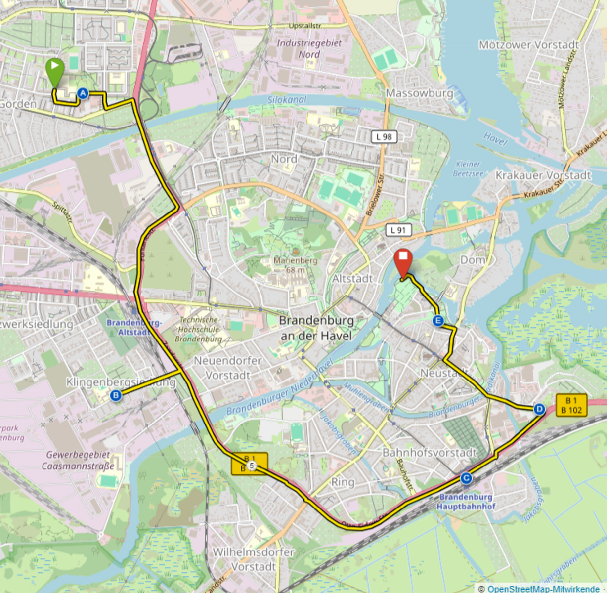 Die Kidical Mass in Brandenburg an der Havel startet an der Wilhelm-Busch-Schule in der Beethovenstraße auf dem Görden um 14:15, Abfahrt ist um 14:30 Uhr. Nach der Überquerung des Silokanals auf der Gördenbrücke biegen wir auf den Zentrumsring ein, von dem wir aus einen Abstecher zur Klingenberg-Grundschule in der Klingenbergstraße machen. Von dort geht es gegen 15 Uhr weiter den Zentrumsring entlang, wobei wir einen kurzen Halt an der Kreuzung mit der Wilhelmsdorfer Straße einlegen werden. Am Hauptbahnhof vorbei geht es über Potsdamer Straße und Sankt-Annen-Straße stadteinwärts, und am Neustädtischen Markt vorbei über Augustastraße und Hammerstraße zum Packhofgelände, wo wir gegen 16 Uhr ankommen.