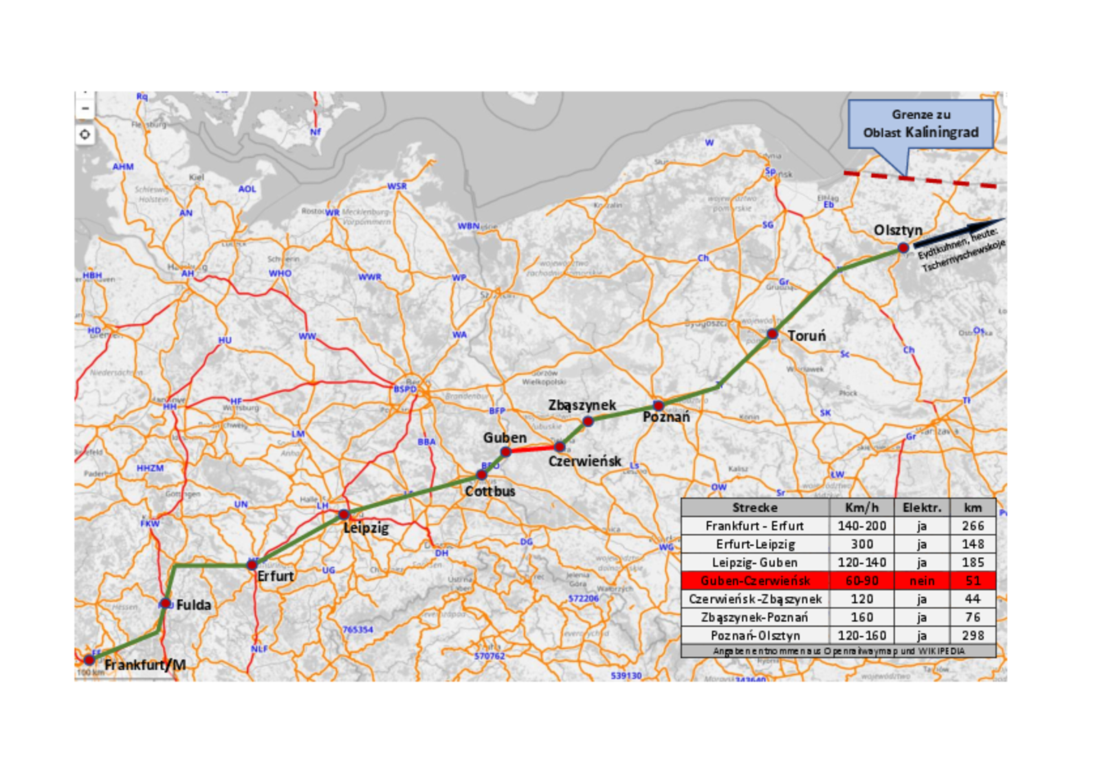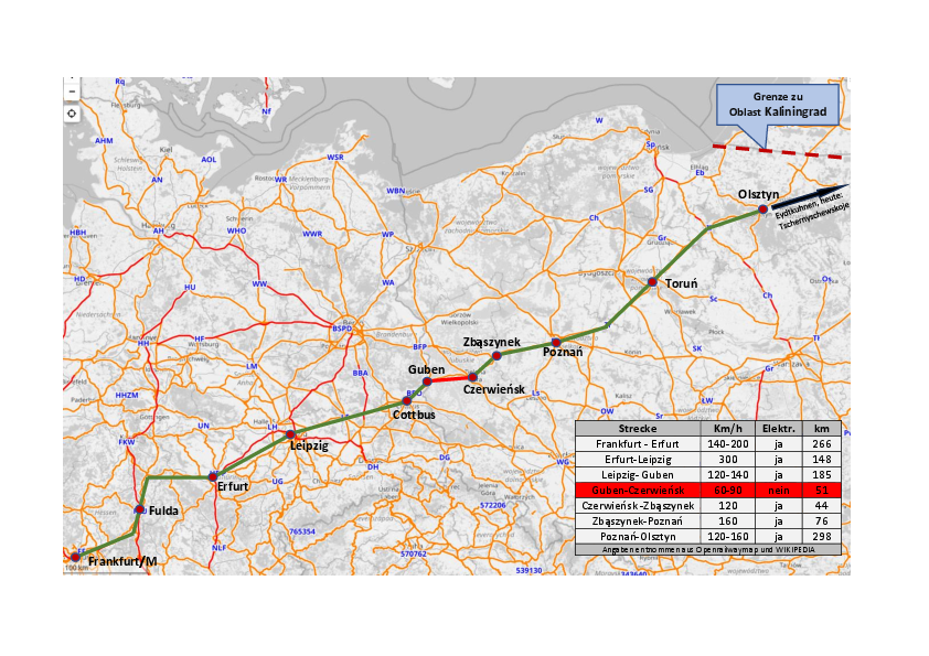 Diese Strecke wäre auch heute bis in die Nähe der Grenze zum Oblast Kaliningrad fast durchweg elektrisch befahrbar - mit Ausnahme des Teilstücks Guben - Czerwieńsk.