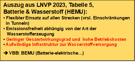 Und auch der VBB hat sich vermutlich von der H2-Nutzung verabschiedet, denn in der Ausschreibung des Netzes Ostbrandenburg werden für oberleitungsfreie Strecken batterie-elektrische Fahrzeuge (BEMU) gefordert.