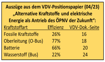 Der VDV veröffentlichte im April 2023 ein Positionspapier unter o.g. Titel. Die dort genannten Effizienz-Werte für die einzelnen Antriebsarten ähneln stark den Werten aus unserem Beitrag in o.g. Rundbrief.