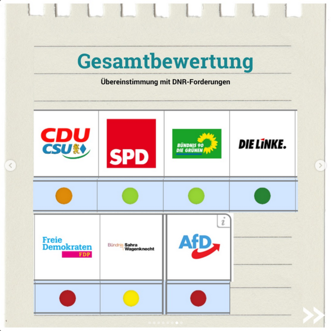 Der Deutsche Naturschutzring (DNR) hat sich mit CDU/CSU, SPD, Grüne, Linke, FDP, BSW und AfD die Programme der größten Parteien unter die Lupe genommen und mit ihren Positionen der Natur-, Tier- und Umweltschutzverbände verglichen.