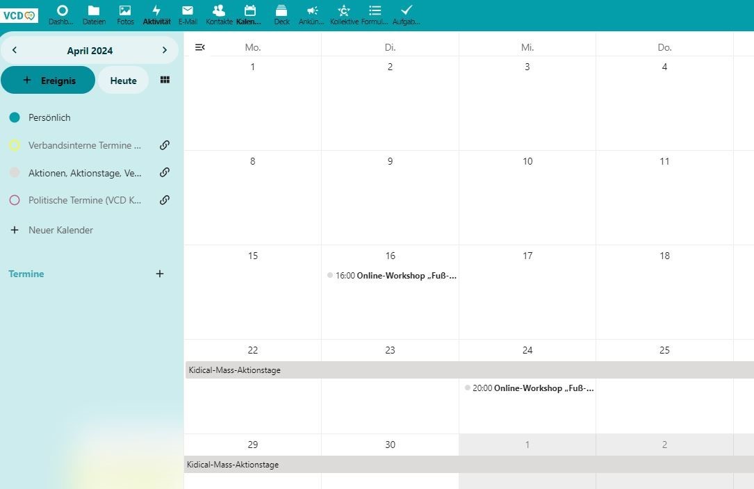 Mit der Cloud (Nextcloud) können Haupt- und Ehrenamtliche digital zusammenarbeiten. Für VCD-Mitglieder kann ein Zugang eingerichtet werden (E-Mail mit: Vor- und Nachname, E-Mail-Adresse, Landesverband, Gliederung vor Ort, ggf. weitere gewünschte Gruppen – an verband@vcd.org).