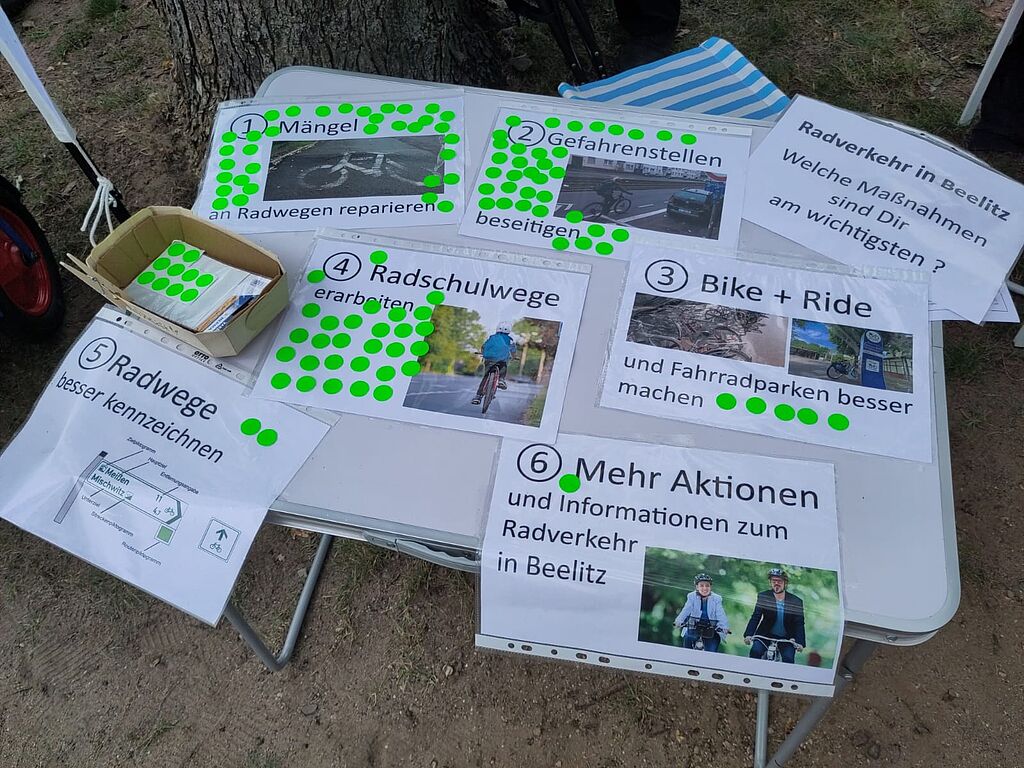 Die Fahrradinitiative Beelitz kümmert sich als Ortsgruppe des VCD darum, Schritt für Schritt die Themen des Radverkehrskonzepts der Stadt Beelitz auf die Straße zu bringen. Im September nutzten wir auf dem Familienfest der Stadt die Gelegenheit, Leute zu fragen, was ihnen eigentlich am wichtigsten ist: Die Aufgaben „Mängel beseitigen“ und „Gefahrenstellen beheben“ bekamen mit Abstand die meisten Punkte, dicht gefolgt von „Sichere Schulwege“. Weniger wichtig war den Befragten „Radwege besser ausschildern“ oder „Aktionen“. Wer mit dem Rad unterwegs ist, wünscht sich also vor allem sichere Routen mit intaktem Belag. Natürlich haben wir auch alle erreichbaren Menschen darauf angesprochen, dass die Zahl der Mitglieder unserer ehrenamtlichen Arbeit mehr Kraft verleiht. Mindestens zwei Familien haben sich fest vorgenommen, diesen Monat beizutreten. Wir freuen uns auf euch!