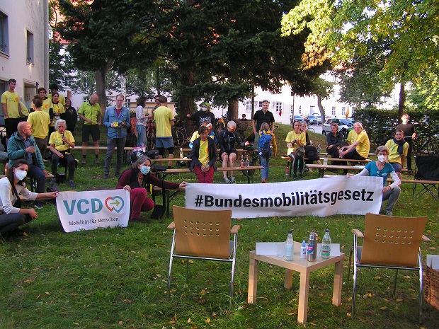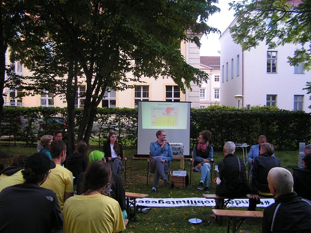 1.9.2021: Großer Empfang der Radler:innen auf ihrer letzten Etappe vor Berlin mit Diskussion und open-air-Kino.